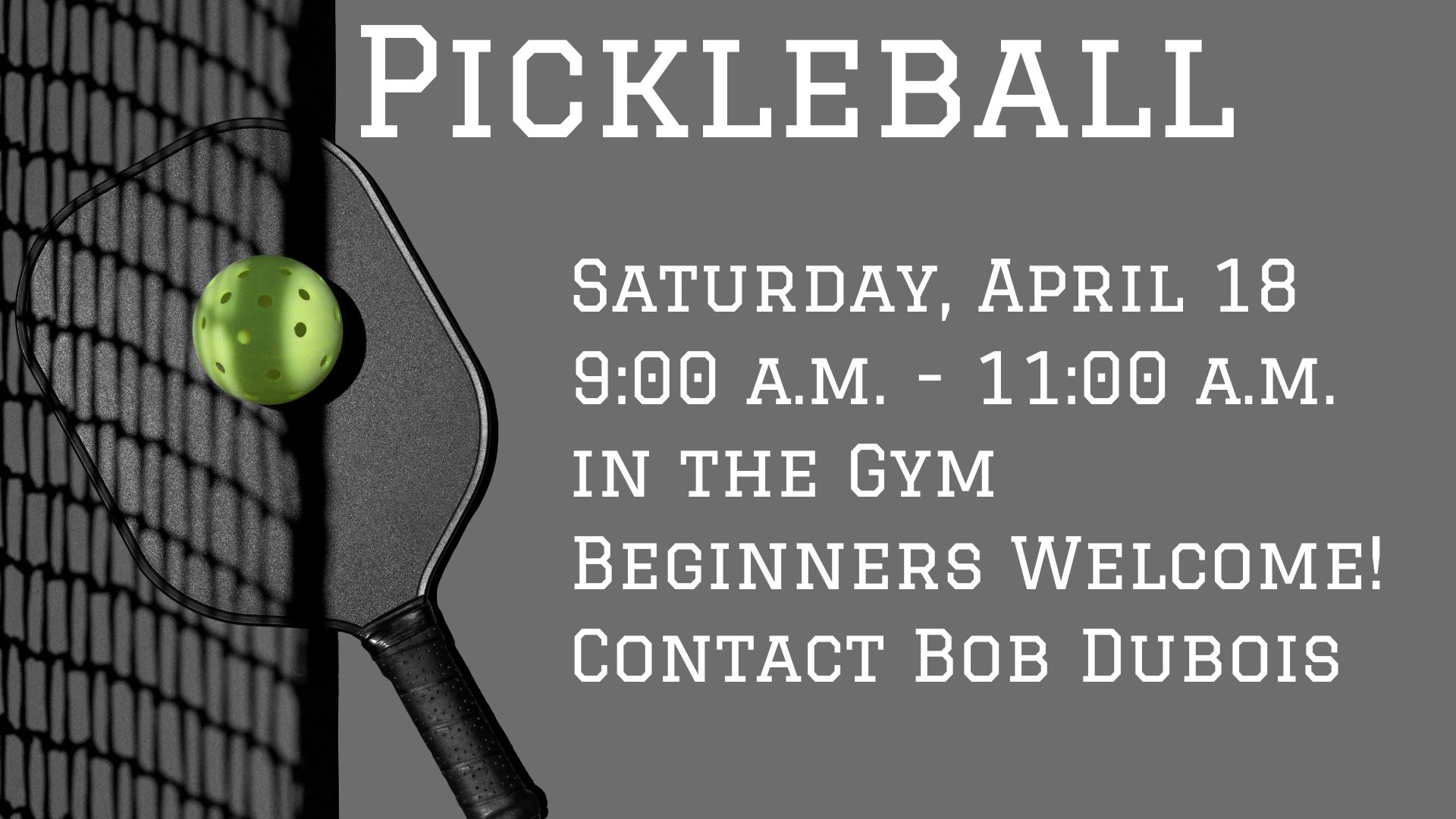 Pickleball at the church! Saturday, April 18, 9-11am. This is a "beginner pickleball" event and everyone is welcome. Connect with Bob D with any questions.